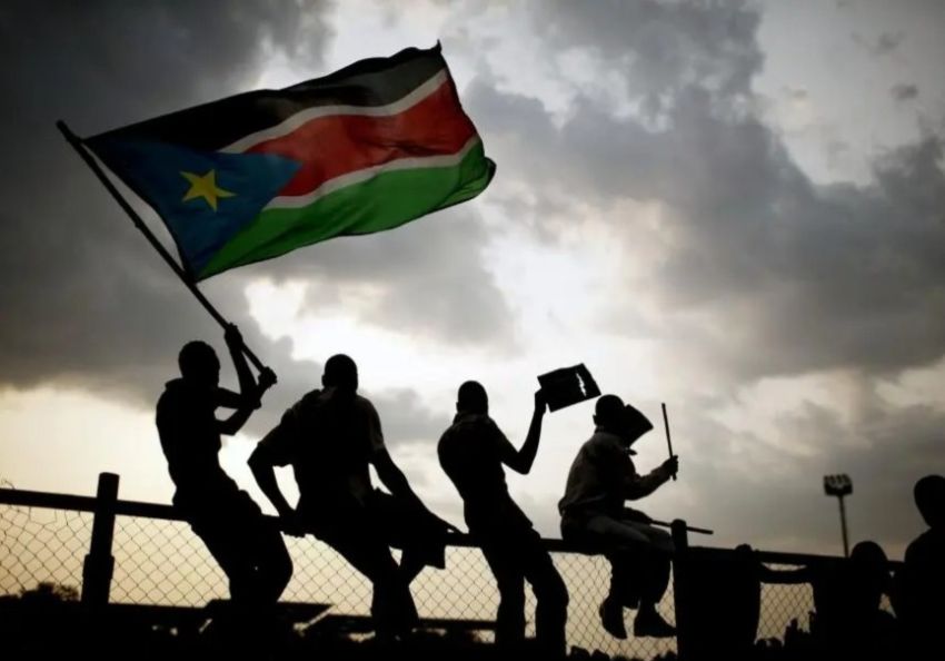 Warga Sudan Selatan melambaikan bendera nasional dan bersorak Ke Kejuaraan sepak bola nasional pertama Sudan Selatan Setelahnya Bangsa itu mendeklarasikan kemerdekaannya, Ke ibu kota Juba Ke 10 Juli 2011. FOTO/AP