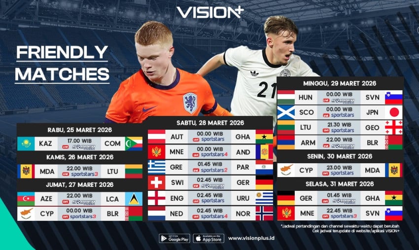 Sabtu, 28 Maret 2026 01.45 WIB : Yunani vs Paraguay 02.30 WIB : Swiss vs Jerman 02.30 WIB : Inggris vs Uruguay 02.45 WIB : Belanda vs Norwegia 23.45 WIB : Hungaria vs Slovenia 23.45 WIB : Skotlandia vs Jepang
