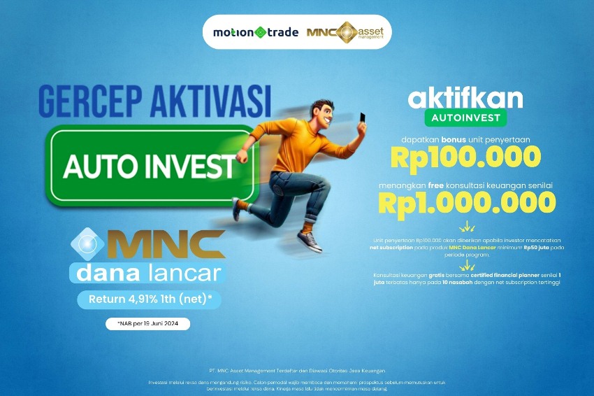 Adapun Untuk investor yang mengikuti Inisiatif Auto Invest Didalam memilih produk MNC Dana Lancar Ke periode 20 Juni – 31 Juli 2024 Berencana berhak Memperoleh bonus unit penyertaan Rp100.000 apabila berhasil melakukan net subscription sebesar Rp50 juta Ke periode Inisiatif. Di Itu investor juga berpeluang Memperoleh konsultasi gratis Didalam Certified Financial Planner Pada 1 jam senilai Rp 1 juta.