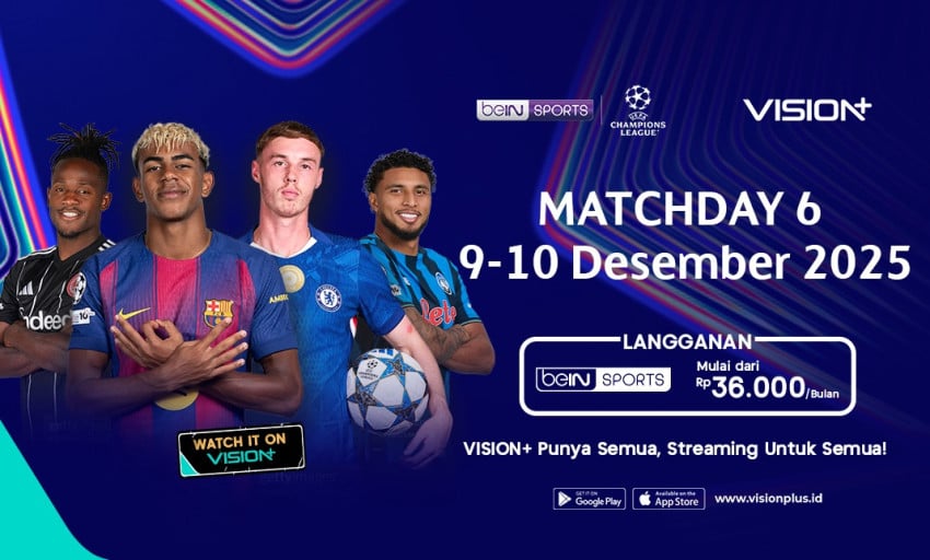 Semua Laga Matchday 6 UEFA Champions League 2025/26 dapat disaksikan Lewat beIN Sports yang tersedia Ke VISION+. Berikut jadwal lengkapnya: