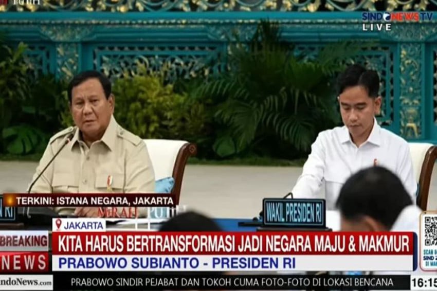 Kepala Negara Prabowo Subianto Memberi pengarahan kepada kepala Daerah se-Papua Di Istana Bangsa, Jakarta, Selasa (16/12/2025). Foto: Sindonews