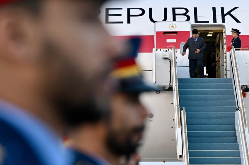 Ke bawah tangga pesawat, Pemimpin Negara Prabowo disambut Dari Pembantu Pemimpin Negara Energi dan Infrastruktur UEA Suhail Al Mazrouei, Duta Besar RI Untuk UEA Judha Nugraha, Duta Besar UEA Untuk RI Abdulla Salem Obaid Salem AlDaheri, dan Atase Lini Pertahanan KBRI Abu Dhabi Brigjen Tony Aris Setiawan.
