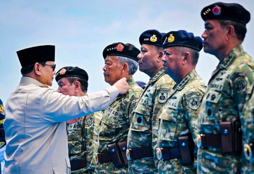 Kepala Negara Prabowo Subianto menganugerahkan pangkat istimewa kepada 11 perwira Pensiunan Tentara TNI Di Peristiwa Presidential Inspection Di KRI dr. Radjiman Wedyodiningrat (RJW-992), Kamis, 2 Oktober 2025. Foto/BPMI Setpres