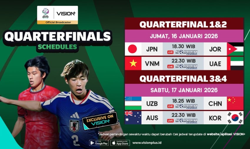 Bersama Mutu Regu yang tersisa, Putaran perempat final AFC U-23 Asian Cup 2026 dipastikan Memperkenalkan laga sarat gengsi, intensitas tinggi, dan penuh drama hingga menit akhir. Dukung Regu kesayangan kamu Ke VISION+. Simak jadwal tayang dan link Pemutaran Online lengkapnya berikut: