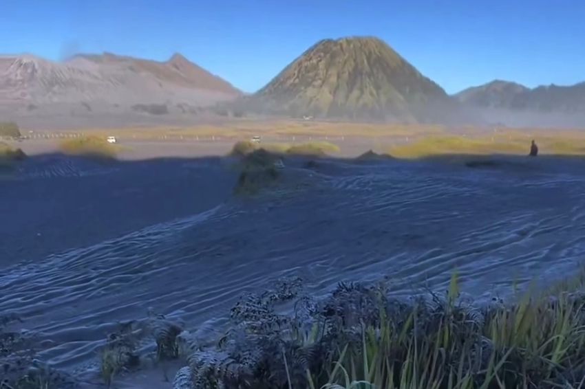 Tampak Di video yang ada beberapa Pada Di kawasan Gunung Bromo yang masuk Taman Nasional Bromo Tengger Semeru (TNBTS), mulai diselimuti salju. Beberapa area savana dan lautan pasir juga terlihat mulai bermunculan salju.