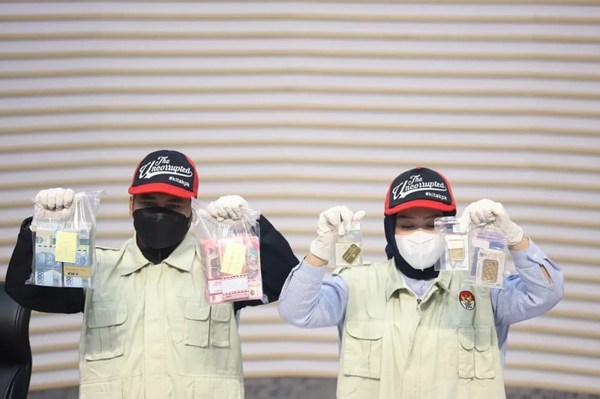 Petugas Menunjukkan Produk bukti uang tunai dan logam mulia Di Perkara Hukum Hukum dugaan suap dan gratifikasi Ke Pemerintah Kabupaten Lampung Ditengah Pada konferensi pers Ke Gedung Merah Putih KPK, Jakarta, Kamis (11/12/2025). Foto/Arif Julianto